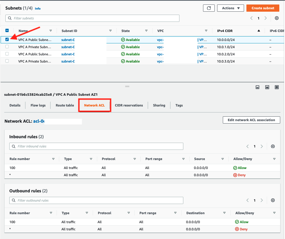 Select any of the subnets, and scroll down to the Network ACL tab to look at the default NACL rules. Rules are evaluated in order from lowest to highest. If the traffic doesn’t match any rules, the * rule is applied, and the traffic is denied. Default NACLs allow all inbound and outbound traffic, as shown below, unless customized.