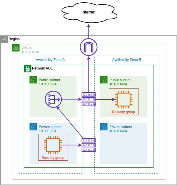 10.0.2.100and external connectivity toexample.comvia the NAT Gateway. -