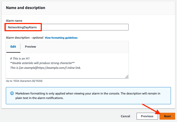 NetworkingWorkshopAlarmas the Alarm name - Click Next