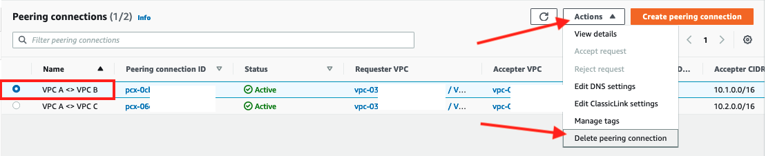 VPC A <> VPC Bpeering connectoin and delete it by clicking Actions and selecting Delete peering connnection