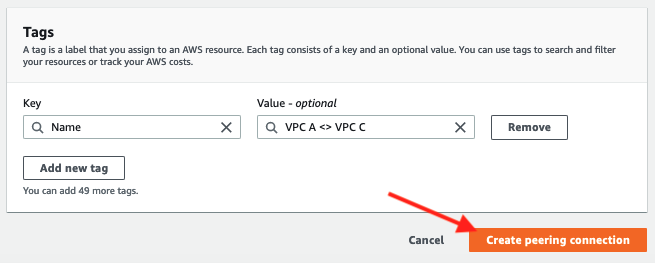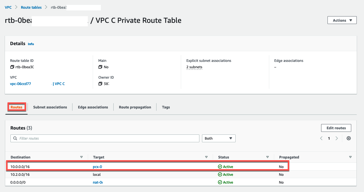 4. Add route entry for "VPC C" using the CIDR range10.2.0.0/16and selecting Peering ConnectionVPC A <> VPC Cfor the target